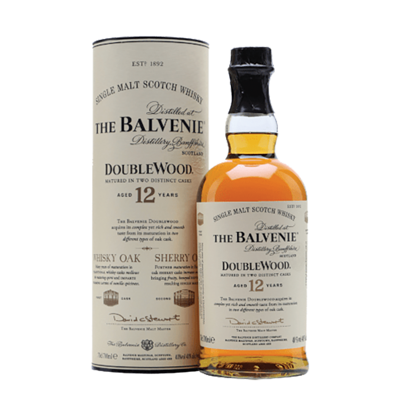 Balvenie Doublewood 12 yr Single Malt Scotch Whisky – 20cl The Balvenie Doublewood is a 12 year old single malt whisky that takes its distinctive character from being matured in two different wood (cask) types. The first period of maturation is a traditional oak whisky cask, it is then transferred to a first fill European oak sherry cask. Each wood gives the whisky different qualities, the traditional casks will soften and add character to the whisky, whilst the second sherry wood brings depth and fullness of flavour